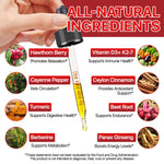 Découvrez une formule liquide puissante, conçue pour ceux qui veulent soutenir leur vitalité naturellement. Grâce à l’absorption rapide des gouttes liquides, votre corps profite directement des bienfaits d’un mélange unique : Cayenne, Aubépine, Betterave, Curcuma, Cannelle de Ceylan, Berbérine, Panax Ginseng, Vitamines K2 + D3.